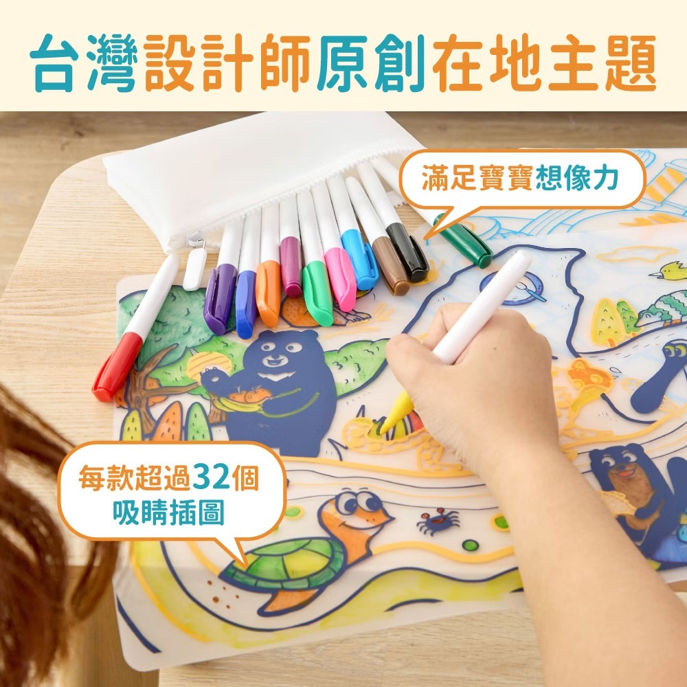來自台灣設計,擁有32款超吸睛插圖,還附上四色環保白板筆及可加購專屬收納袋。