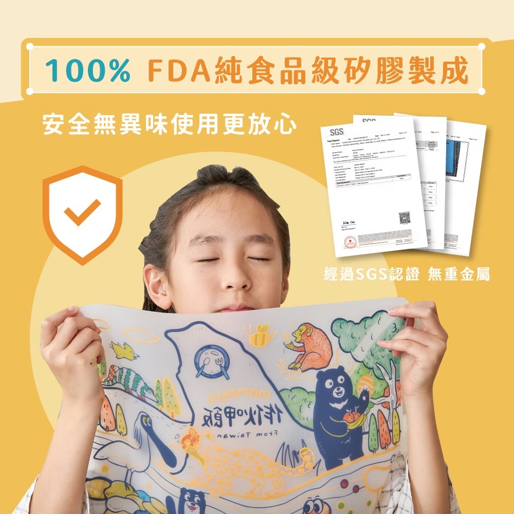 餐墊為100%FDA矽膠材質 防水、防油、耐高溫,背面還有做止滑。